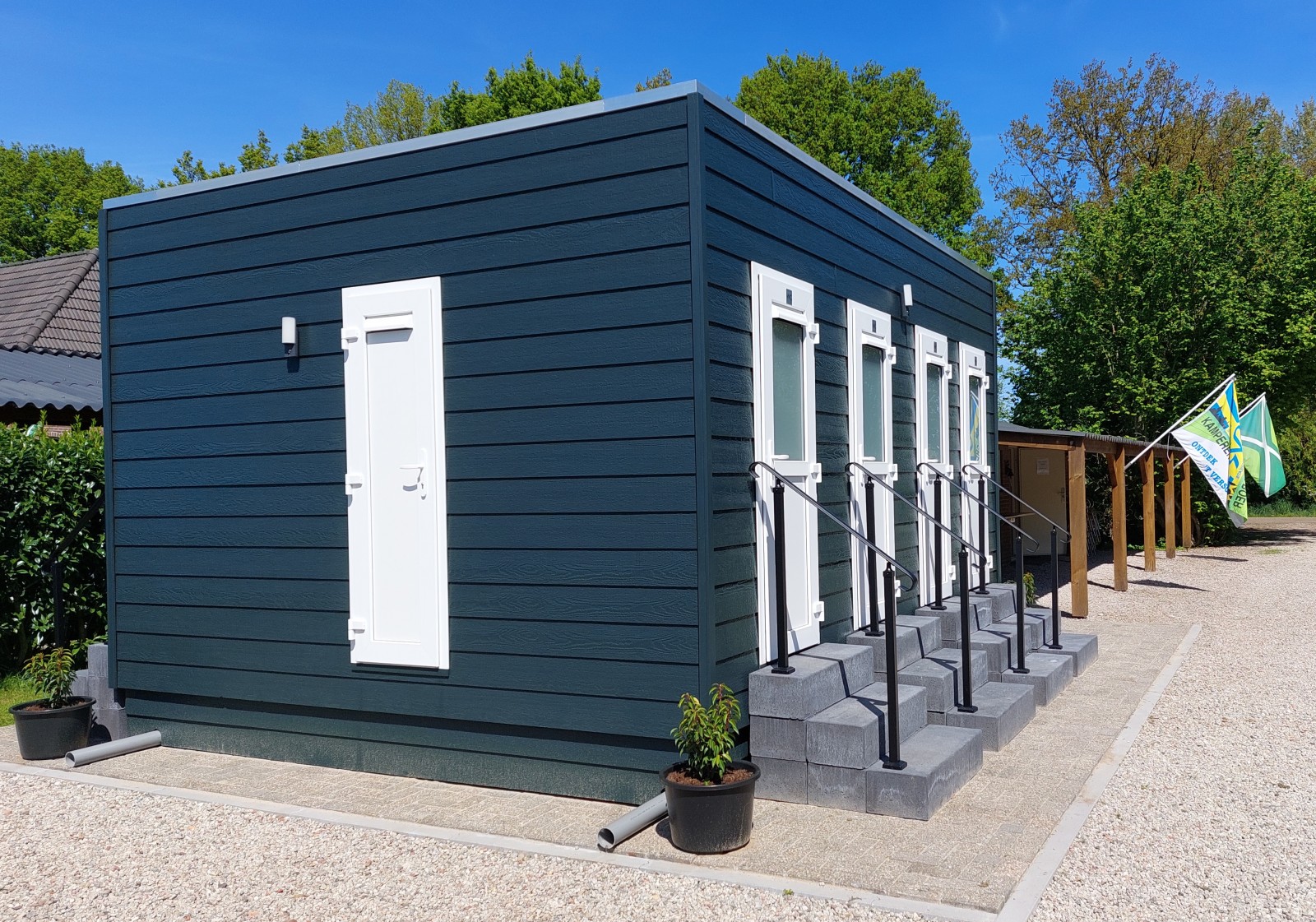 Het sanitair is verdeeld over twee gebouwen.